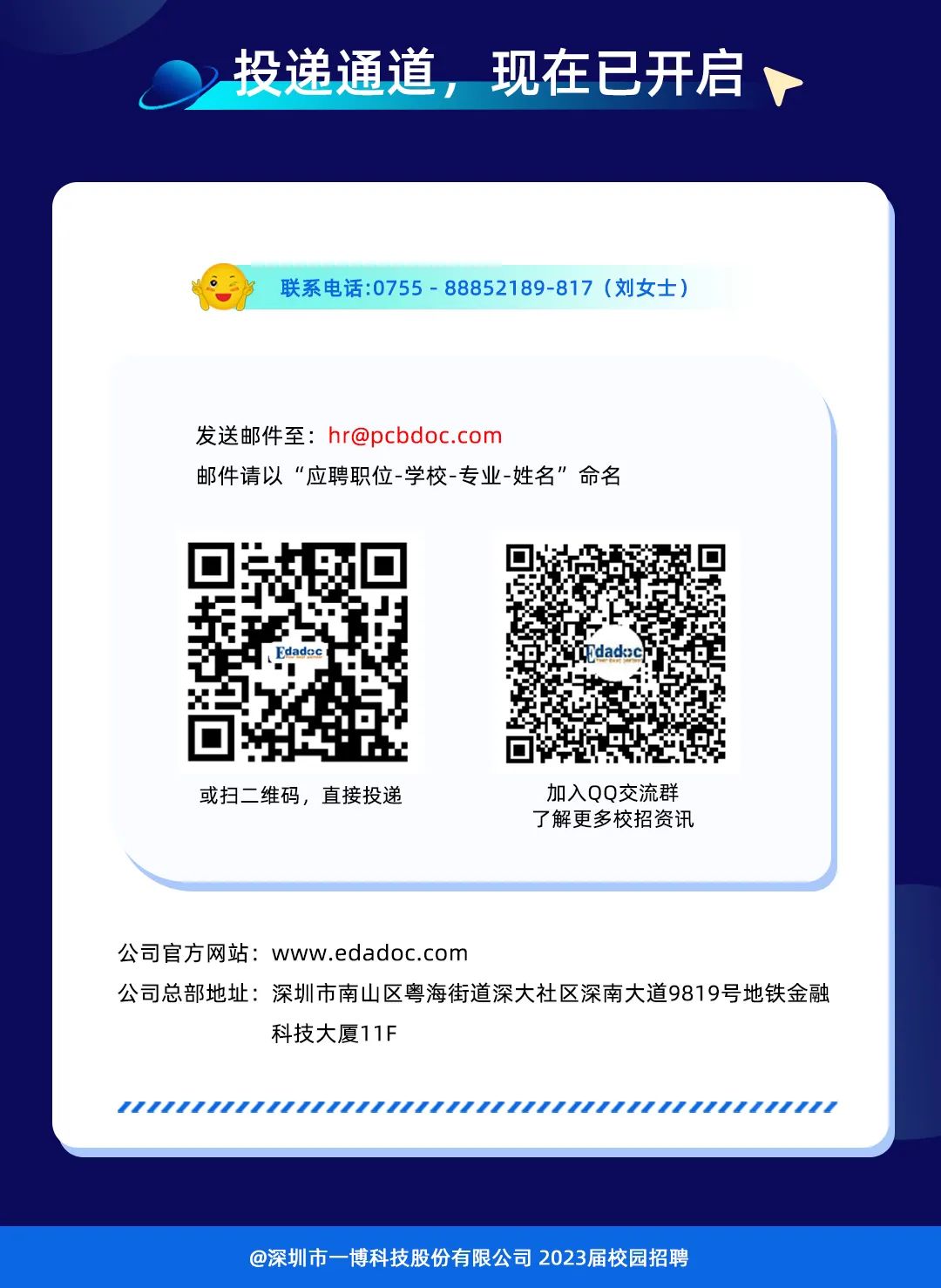 简历请投递至:hr@pcbdoc.com,邮件请以“应聘职位-学校-专业-姓名”命名