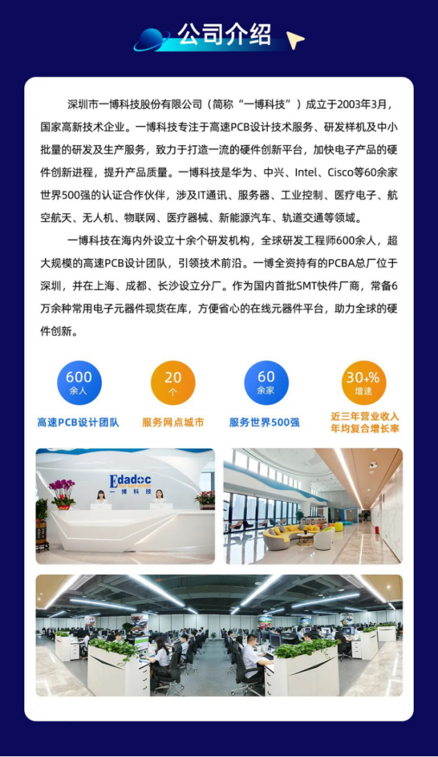 深圳市一博科技股份有限公司(简称“一博科技”)成立于2003年3月,国家高新技术企业。一博科技专注于高速PCB设计技术服务、研发样机及中小批量的研发及生产服务,致力于打造一流的硬件创新平台,加快电子产品的硬件创新进程,提升产品质量。一博科技是华为、中兴、Intel、Cisco等60余家世界500强的认证合作伙伴,涉及IT通讯、服务器、工业控制、医疗电子、航空航天、无人机、物联网、医疗器械、新能源汽车、轨道交通等领域。