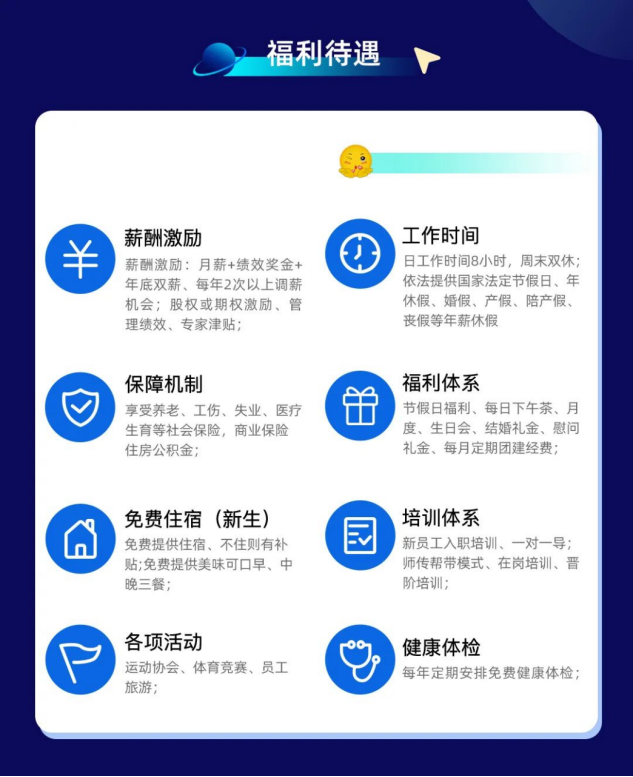 福利体系:五险一金、健康体检、员工宿舍、节假日福利、每日下午茶、月度生日会、结婚礼金、慰问礼金、每月定期团建经费;