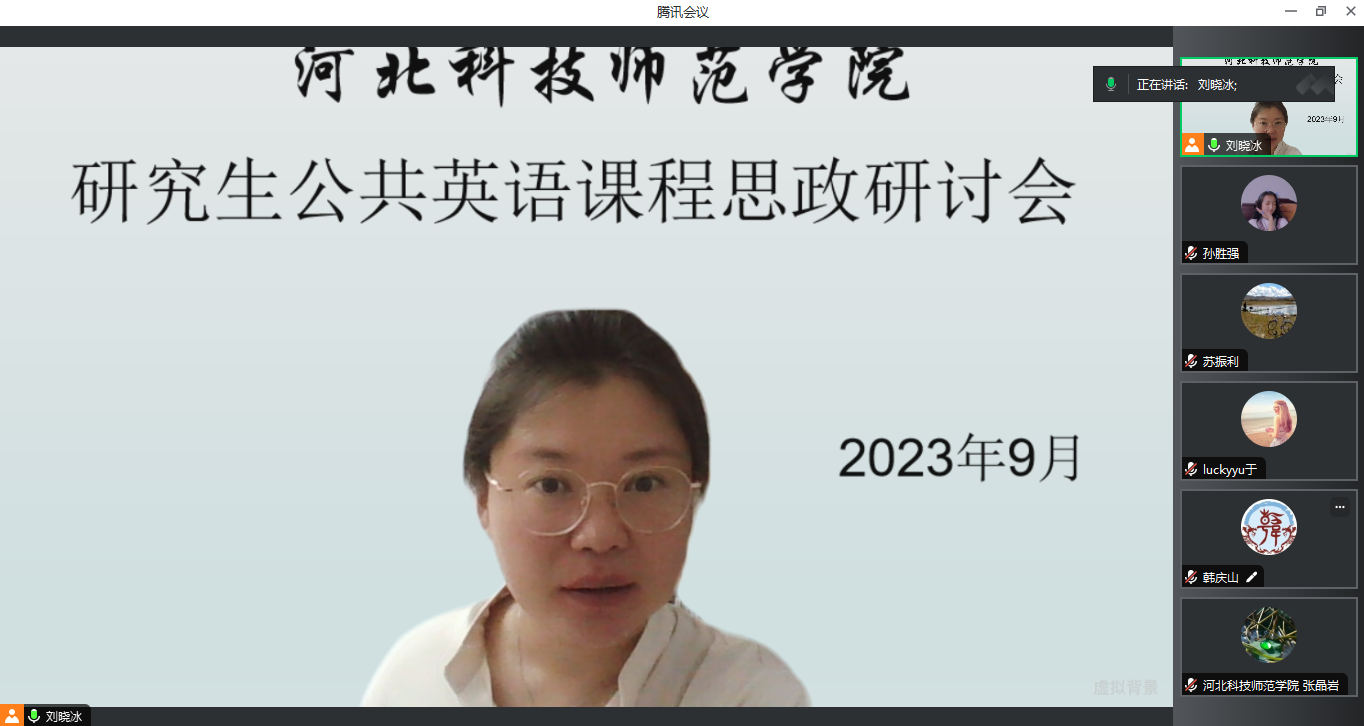 2023年9月8日beat365官方网站学科教学(英语)教学部组织硕士研究生公共英语(第一外国语)任课教师开展教学研讨活动,会议主题围绕研究生公共英语课程思政展开,研讨内容包括:针对教材的各个章节选出精讲主题和配套的练习,任课教师可以根据学生的具体专业情况灵活把握课程思政的切入点,可以利用超星学习通教学平台布置英语词汇、小组活动及主题作业等学习任务,并积极开展课程思政。