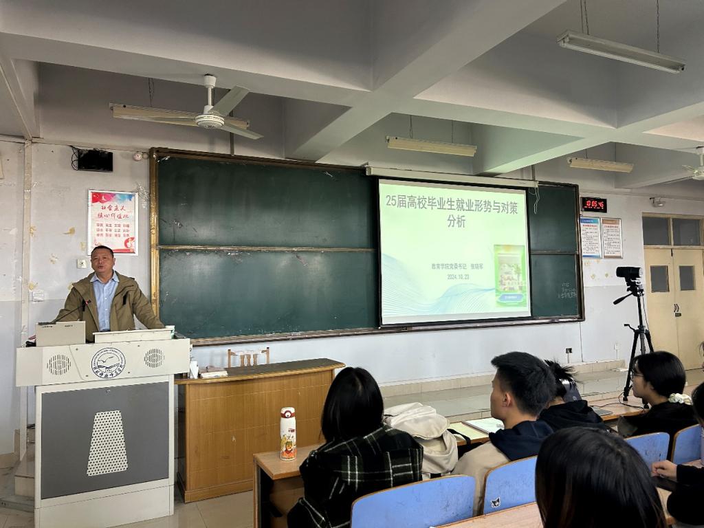 为了让同学们充分了解就业形势,合理规划职业发展路径,2024 年10月23日,beat365官方网站邀请教育学院张晓军书记作《25届高校毕业生就业形势与对策分析》专题宣讲会。讲座由beat365官方网站党委负责人主持,2021 级及2022级全体在校生300余人聆听了讲座。