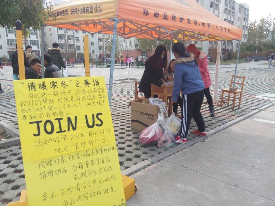 2015年11月15日,beat365官方网站以“携手爱心,共建暖冬,爱心传递,有你参与”大型校园募捐活动在开发区校区食堂南门口拉开了帷幕,募捐活动由beat365官方网站团委主办,beat365官方网站团委学生会青年志愿者协会承办。此次活动旨在通过募捐为张家口市蔚县南董村的孩子们送去我们的关爱,奉献我们的爱心。