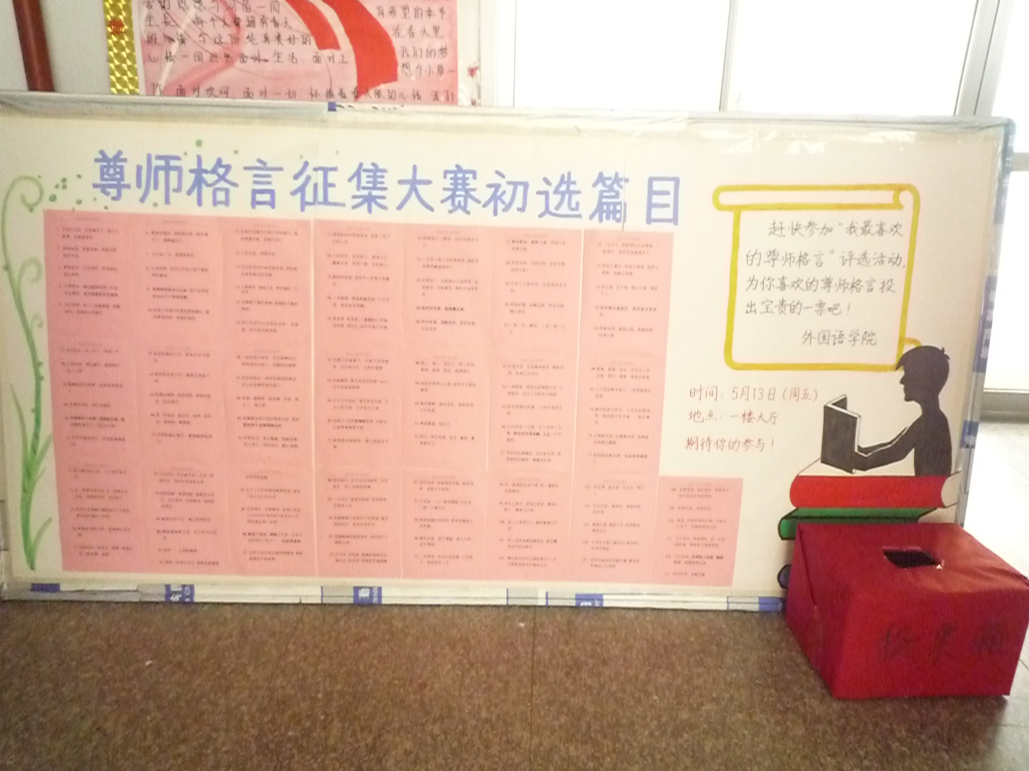 活动受到了学院广大学生的热情欢迎,同学们通过健康、积极向上的原创格言充分表达了对恩师的敬爱之心和感激之情。本次活动共征集到尊师格言500余条,其中通过初选的100多个优秀篇目以展板的形式在主教学楼走廊展出,并号召全校同学积极参与投票,选出自己最喜欢的尊师格言,最终评选出优秀格言一、二、三等奖16名,优秀奖10名,最佳组织奖2名。