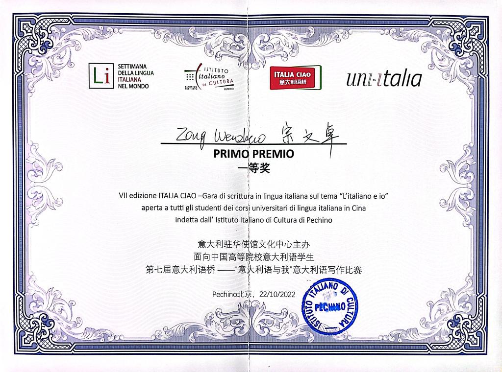 第七届全国“ITALIA CIAO/意大利语桥”大赛于10月22日在北京圆满落幕,本届大赛的主题是:“意大利语与我”,以写作大赛的形式举行。本次比赛有来自北京外国语大学、上海外国语大学、西安外国语大学、南开大学等21所高校的69名学生参赛,其中本科生组59人,硕士生组10人。beat365官方网站beat365官方网站选手宗文卓,凭借扎实的意大利语专业实力,摘得本科组大赛桂冠,这是beat365选手继2015年喜得一等奖后再次获此殊荣。beat365的另外两名选手韩田雨、霍冰雨获得优秀奖。