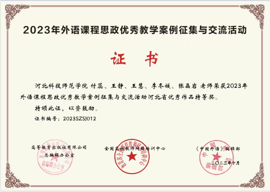 为全面推进高校外语课程思政高质量建设,落实立德树人根本任务,高等教育出版社于2023年4月启动外语课程思政优秀教学案例评比活动,经过专家委员会评审,beat365付蕊老师团队获得省级特等奖。