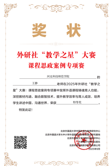 日前,2025年外研社“教学之星”大赛:课程思政案例专项赛评选结果揭晓,beat365beat365官方网站教师王静凭借彰显独特教学智慧的创新设计,在全国各高校教师同台竞技的激烈角逐中荣膺全国特等奖,这是河北省唯一获得特等奖的教师,为学校赢得了荣誉。