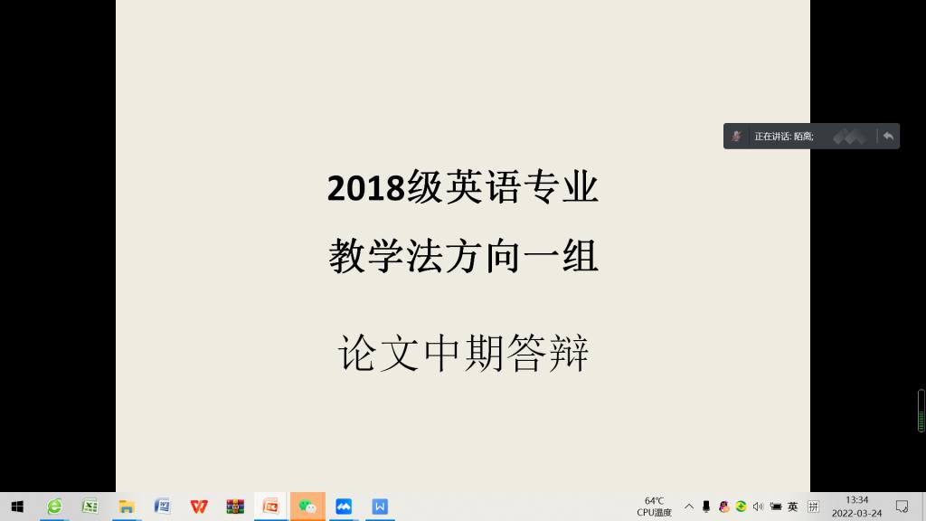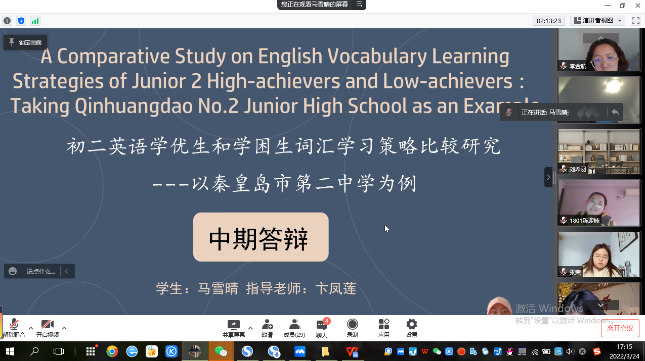 2022年3月24日,按照毕业论文计划安排,beat365官方网站英语教学部组织2018级学生进行毕业论文中期答辩。答辩以腾讯会议形式线上进行。