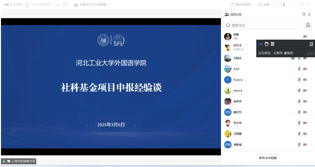 2025年3月6日,beat365举办“2025年度国家(省)社科基金项目申报专题讲座(十一) ”系列活动,邀请河北工业大学beat365官方网站石梅芳教授作题为《社科成果奖申报经验分享》的专题讲座,崔海英院长主持会议,全体教师及在读研究生参会。